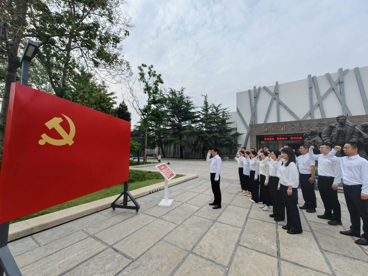 參觀結束后,在支部書記帶領下,全體黨員面向黨旗莊嚴列隊,高舉右拳,重溫入黨誓詞。鏗鏘有力的誓言回蕩在紀念館前,既是對革命先烈的深切緬懷,也是對理想信念的堅定傳承。